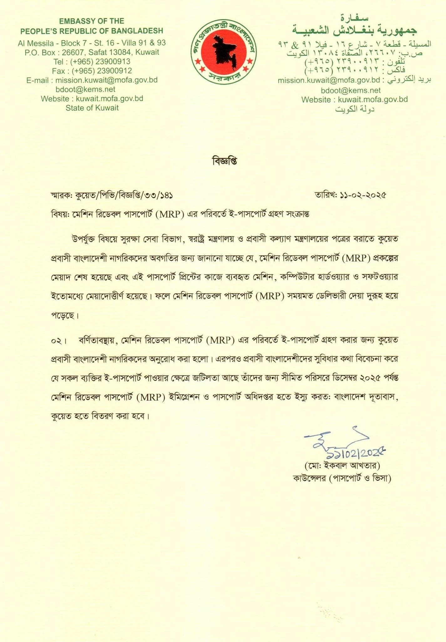 তবে যাদের ই-পাসপোর্ট পেতে জটিলতা রয়েছে, তাদের জন্য সীমিত পরিসরে ২০২৫ সালের ডিসেম্বর পর্যন্ত মেশিন রিডেবল পাসপোর্ট ইমিগ্রেশন ও পাসপোর্ট অধিদপ্তরের মাধ্যমে ইস্যু করা হবে এবং তা কুয়েতের বাংলাদেশ দূতাবাস থেকে বিতরণ করা হবে।